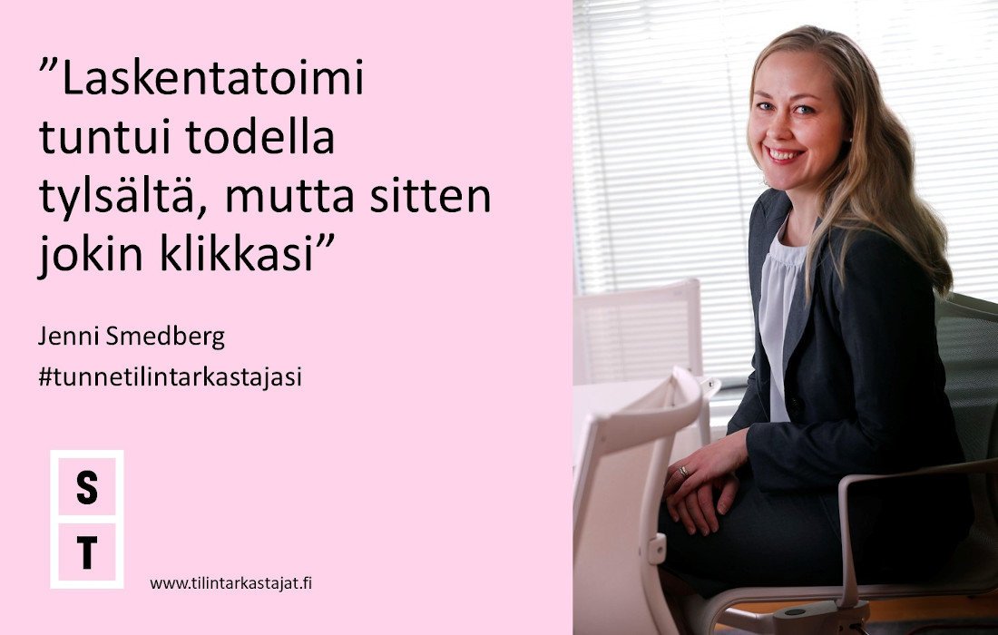 KHT-tilintarkastaja Jenni Smedberg päätyi tilintarkastusalalle mutkan kautta, mutta löysi työelämässä omat vahvuutensa. Nykyään hän toimii myös kouluttajana ja riskienhallintaroolissa.