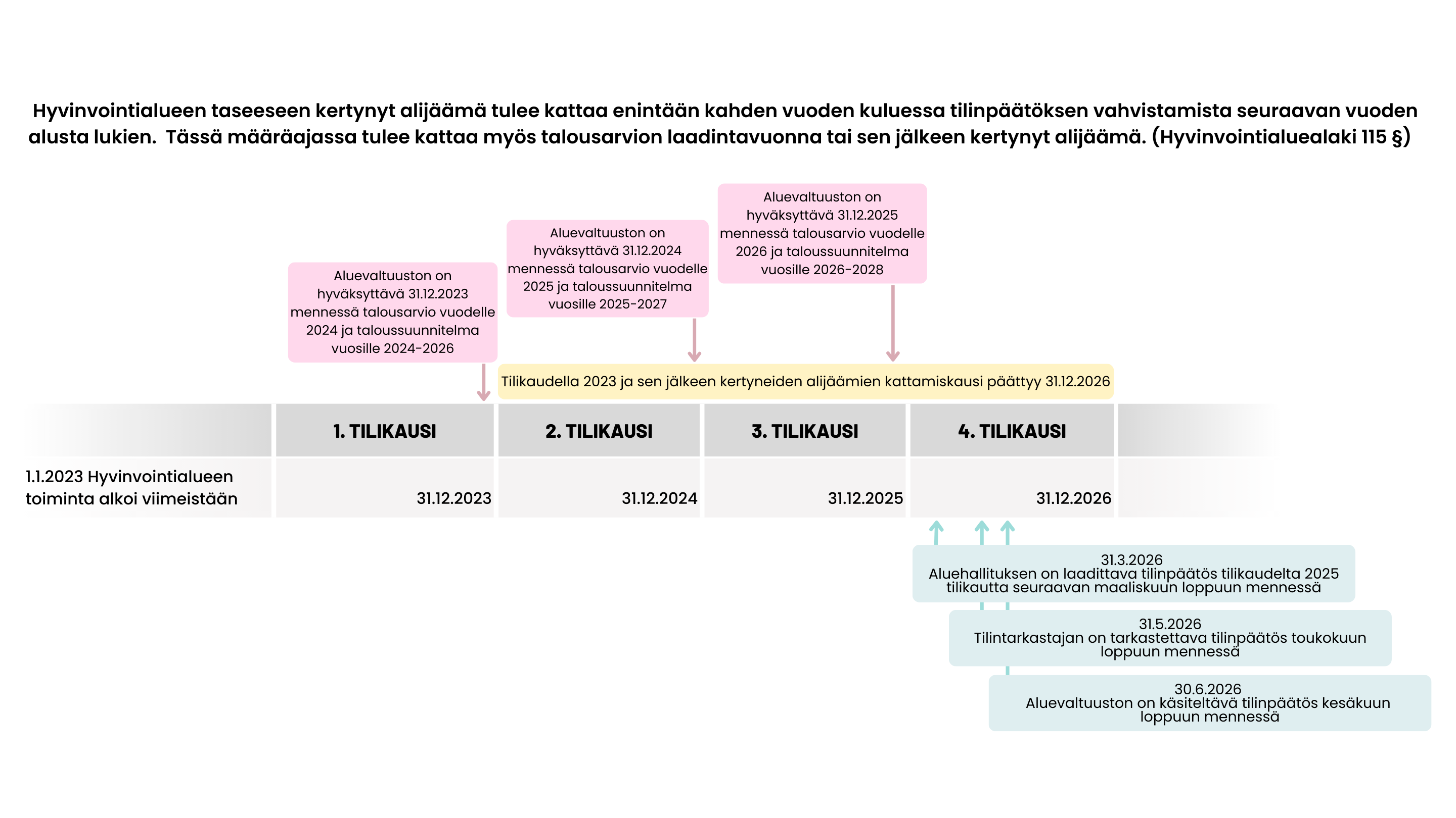 Hyvinvointialueet aloittivat toimintansa vuonna 2022 tai 2023. Ensimmäisenä tilikautena ja sen jälkeen kertynyt alijäämä tulee kattaa viimeistään vuoden 2026 loppuun mennessä.