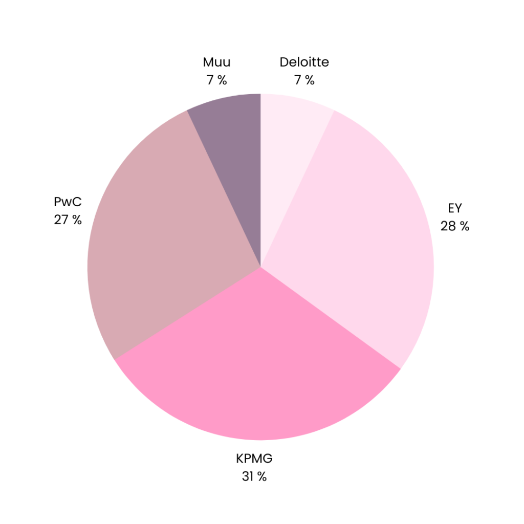Maaliskuussa 2023 kaupparekisteristä kerättyjen tietojen perusteella pörssiyhtiöiden tilintarkastusten jakauma oli muuttunut jonkin verran edellisistä vuosista. KPMG tarkastaa 31 prosenttia, EY 28 prosenttia, PwC 27 prosenttia, Deloitte 7 prosenttia ja muut tilintarkastajat 7 prosenttia pörssiyhtiöistä.