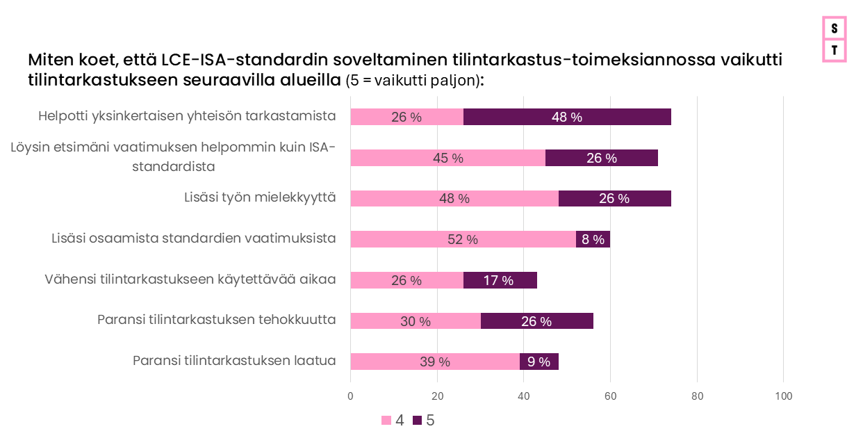 Kyselyyn vastanneet arvioivat LCE-ISA-standardin vaikutuksia eri osa-alueella asteikolla 1–5. Parhaaksi hyödyksi koettiin tilintarkastamisen helpottuminen (keskiarvo 4,0) sekä vaatimusten löytymisen helpottuminen (3,8). Työn mielekkyyden ja tehokkuuden parantuminen saivat myös hyvät arviot (3,8 ja 3,5). Sen sijaan tarkastukseen käytetyn ajan väheneminen ja tarkastuksen laadun paranemisen keskiarvo jäi lähemmäs neutraalia.