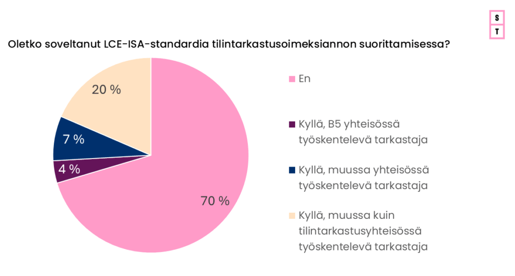 Suomen Tilintarkastajat ry (ST) kartoitti tilintarkastajille suunnatulla jäsenkyselyllä LCE-ISA-standardin käyttöönoton laajuutta ja soveltamiskokemuksia. Kyselyssä saatiin hyvää palautetta ST:n laatimasta suosituksesta sekä STanssiin tehdystä päivityksestä LCE-ISA-standardiin liittyen. Kysely toteutettiin kesän 2025 aikana ja siihen vastasi 82 tilintarkastajaa.