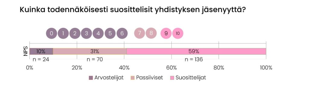 Vuoden 2024 jäsentyytyväisyyskysely osoittaa jäsenten olevan erityisen tyytyväisiä yhdistyksen koulutuksiin ja ammatilliseen tukeen. Joka toinen jäsen suosittelisi yhdistyksen jäsenyyttä kollegoilleen. Yhdistyksen suositteluhalukkuutta mittaava NPS-luku on korkea, 49. Lähes 60 prosenttia vastaajista kuuluu suosittelijoihin, jotka antavat yhdistykselle arvosanan 9 tai 10 asteikolla 0–10. Tulokset kertovat yhdistyksen onnistuneen ydintehtävässään jäsenten ammatillisen osaamisen tukemisessa.