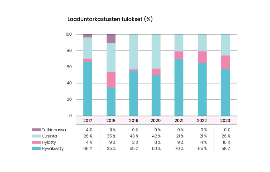 Vuonna 2023 loppuun saatetuista 153 laaduntarkastuksesta 88 (58 %) oli hyväksyttyjä, 25 (16 %) oli hylättyjä ja 40 (26 %) määrättiin uusintatarkastukseen.