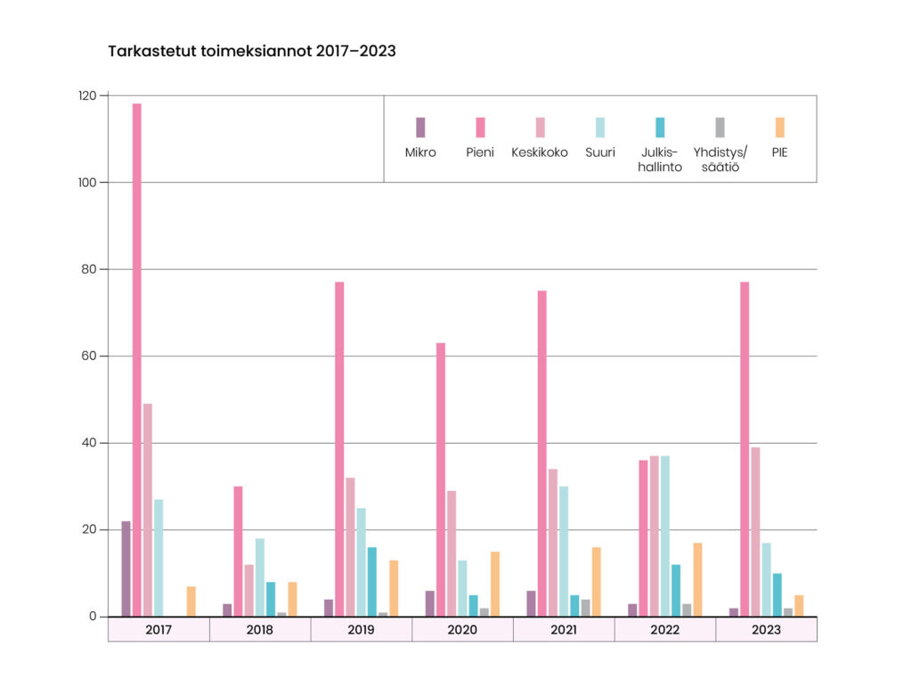 Vuonna 2023 valmistuneista 153 laaduntarkastuksesta noin puolet eli 79 (52 %) kappaletta kohdistui pieniin tai mikrokokoisiin osakeyhtiöihin, 39 (26 %) keskikokoisiin ja 17 (11 %) suuriin. PIE-yhteisöjen tilintarkastuksia oli kohteena 5 (3 %) ja julkishallinnon tilintarkastuksia 10 (7 %).