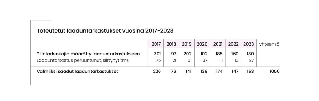 Laaduntarkastuksia peruuntuu muun muassa siksi, että kohteeksi määrätty tilintarkastaja luopuu kirjaimistaan, tarkastus siirtyy kokonaan myöhemmäksi tai niitä ei ehditä saada valmiiksi määräysvuoden aikana. Vuonna 2023 valmistui 153 laaduntarkastusta.
