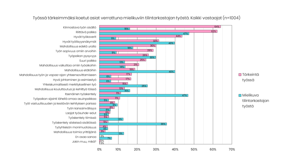 Kyselyssä selvitettiin mielikuvien lisäksi myös näkemyksiä siitä, mitä he odottavat työelämältä. Yleisimmät mielikuvat liittyen tilintarkastajan työhön olivat riittävä palkka, itsenäinen työskentely, hyvät työllisyysnäkymät ja mahdollisuus etätöihin.