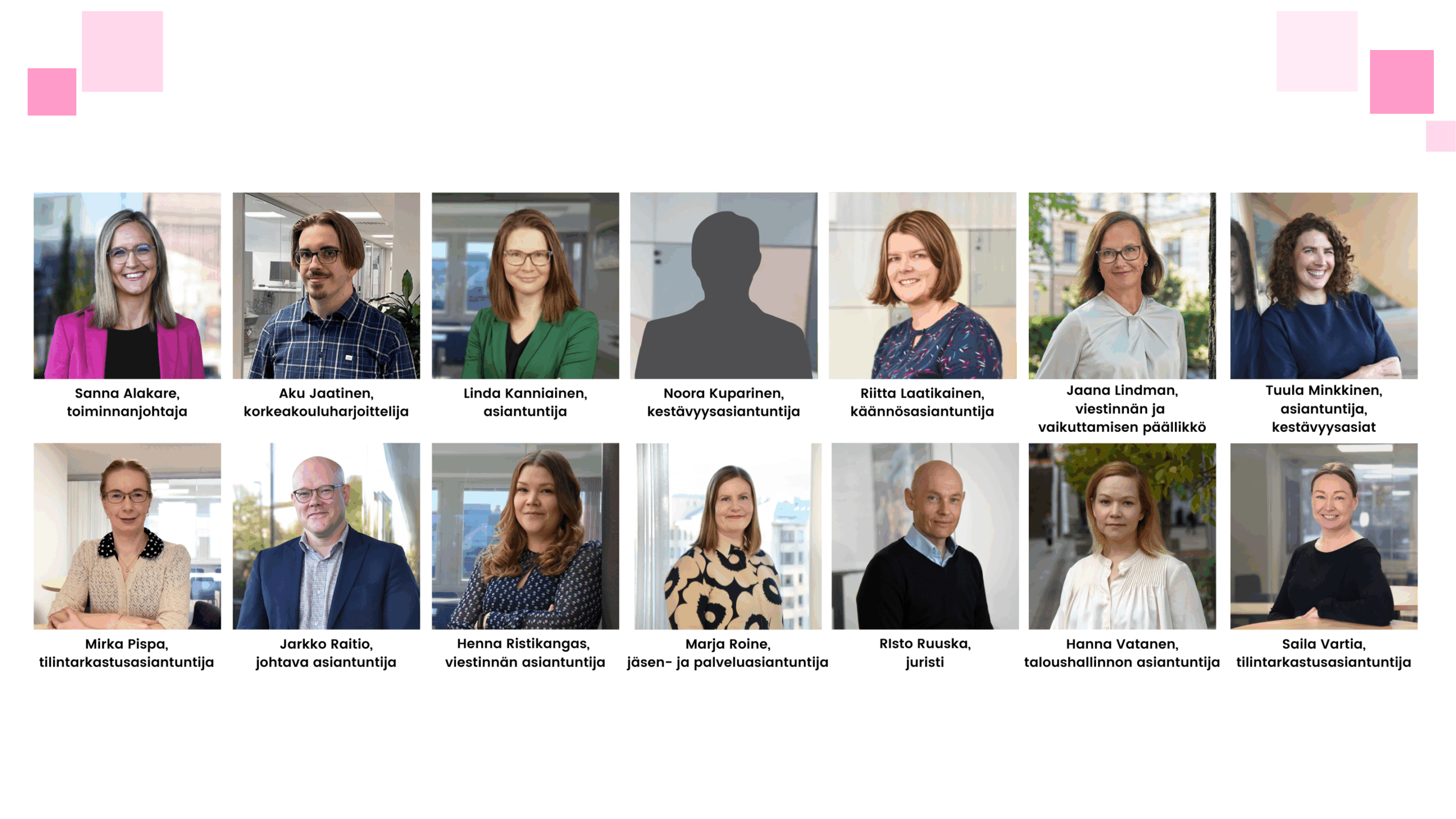 Meillä työskentelee tiivis, mutta monipuolinen joukko asiantuntijoita, jotka tuovat pöytään laajan kirjon osaamista eri aloilta. Tiimimme koostuu tilintarkastus- ja kestävyysasiantuntijoista, johtavasta asiantuntijasta, juristista, viestinnän ja vaikuttamisen ammattilaisista sekä omasta kääntäjästämme. Iloista ja motivoitunutta porukkaamme luotsaa toiminnanjohtaja, joka pitää huolta, että suunta pysyy kirkkaana ja yhteistyö sujuu.