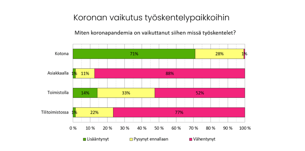 Jäsenkyselyssä kartoitettiin myös koronan vaikutuksia tilintarkastajien työskentelypaikkaan. Oletusten mukaisesti tilintarkastajien työskentely etänä on lisääntynyt. Suurin vaikutus pandemialla on ollut työskentelyyn asiakkaan tiloissa ja tilitoimistoissa. Suurin osa vastaajista kertoi sen vähentyneen.