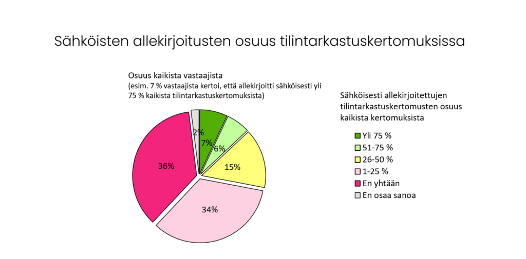 Vastaajien mukaan sähköiset allekirjoitukset ovat toistaiseksi yleisempiä tilinpäätöksissä kuin tilintarkastuskertomuksissa. Asiakkaiden siirtyessä yhä enemmän sähköisen allekirjoituksen käyttöön tilintarkastajatkin vähitellen rohkaistuvat antamaan tilintarkastuskertomuksensa yhä useammin sähköisesti allekirjoitettuna.