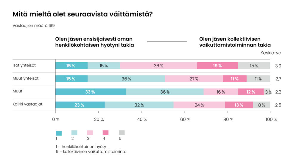 Ne, jotka eivät työskentele tilintarkastusyhteisössä, ovat jäseniä ensisijaisesti oman henkilökohtaisen hyödyn vuoksi (janan vasemmassa reunassa). Myös pienemmissä tilintarkastusyhteisössä työskentelevät ovat jäseniä useammin oman hyötynsä vuoksi, mutta suurissa tilintarkastusyhteisöissä kollektiivisen vaikuttamisen vuoksi jäsenenä oleminen on yhtä yleistä.