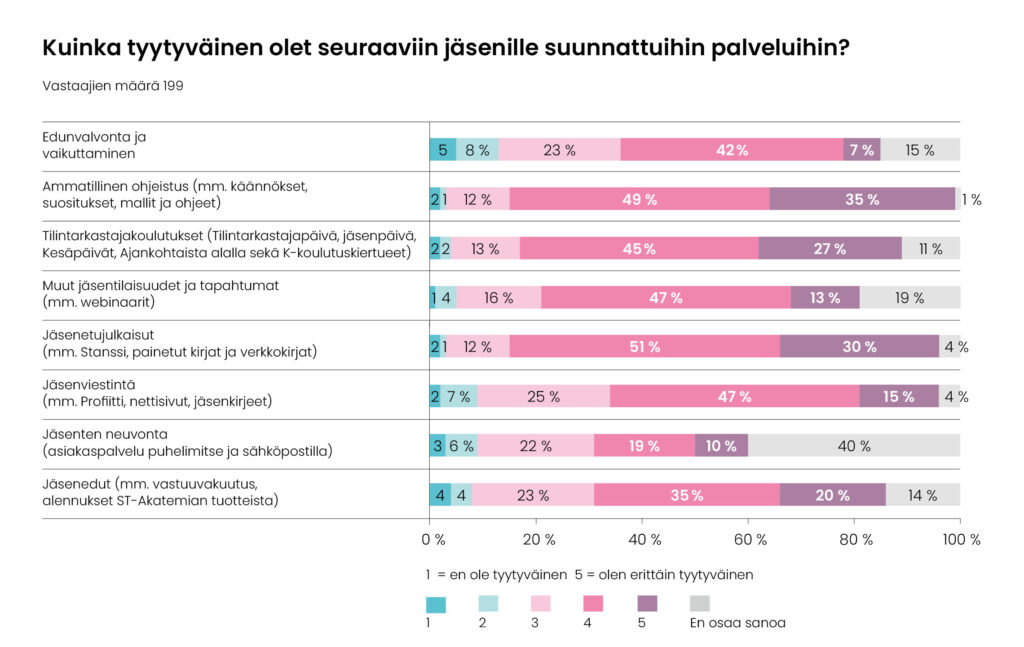 Toteutimme syyskuussa 2023 jäsentyytyväisyyskyselyn, johon vastasi 199 jäsentä. Suurin osa vastaajista on tilintarkastajajäseniä (87 %). Suurin osa vastaajista (68 %) on osallistunut ST-Akatemian järjestämiin tilintarkastajakoulutuksiin ja moni (41 %) myös maksuttomiin jäsenwebinaareihin. Vähäisempiä olivat kokemukset muista maksuttomista yhdistyksen tapahtumista (18 %), ST-Akatemian koulutuksista muille talouden ammattilaisille (12 %), ESG-valmennuksesta (10 %) ja yhdistyksen toimikunnista ja työryhmistä (10 %). Vastaajista 14 % ei ollut osallistunut mihinkään edellä mainituista.
