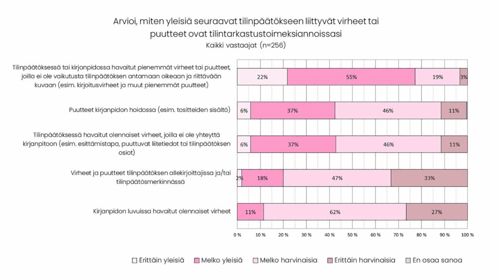 Tilintarkastajilta kysyttiin, kuinka usein he kohtaavat mainittuja virheitä ja puutteita tilintarkastusta tehdessään.