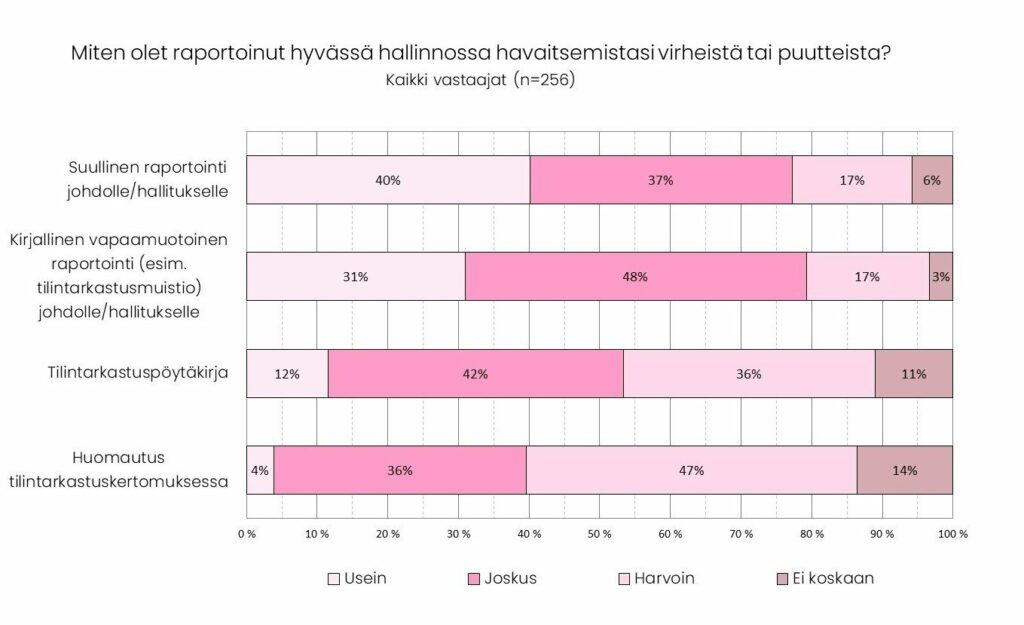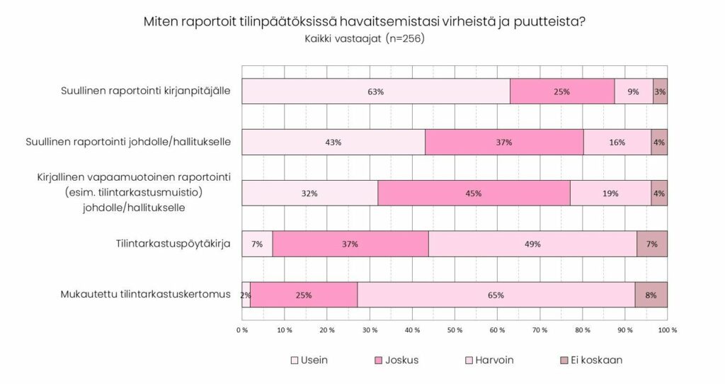 Valtaosa kertoo havaitsemistaan virheistä tai puutteista suullisesti kirjanpitäjälle ja lähes yhtä moni johdolle/hallitukselle. Vapaamuotoinen kirjallinen raportointi on yleistä, mutta tilintarkastuspöytäkirjan antaminen tai tilintarkastuskertomuksen mukauttaminen selvästi harvinaisempaa.