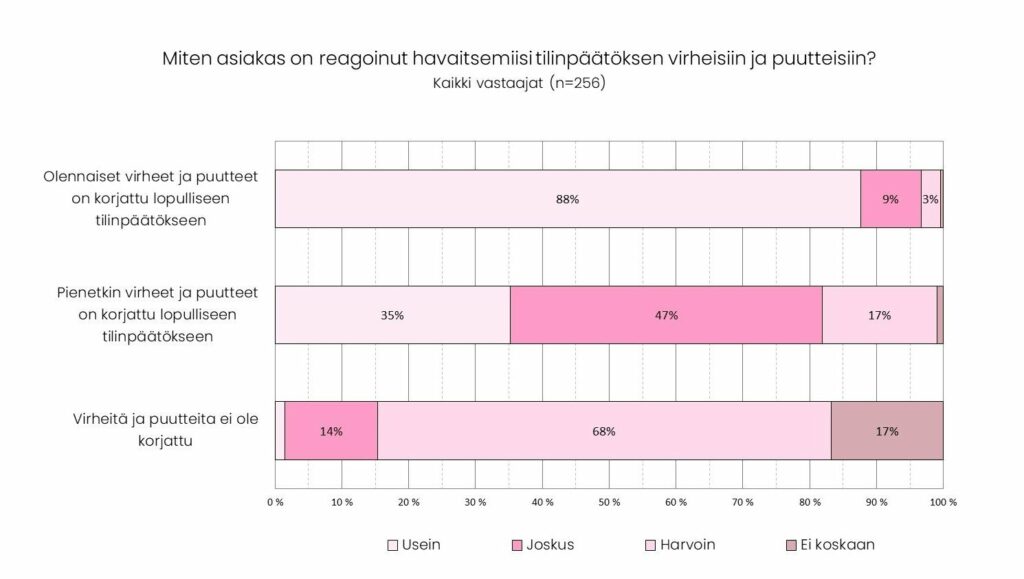 Tilintarkastajan on annettava tilinpäätöksen laatijalle mahdollisuus korjata havaitut virheet ennen tilintarkastuskertomuksen antamista. Tästä syystä mukautettujen tilintarkastuskertomusten määrä ei kerro koko totuutta siitä, paljonko tilintarkastajat kohtaavat virheitä tilintarkastuksissa. Kysyimme tilintarkastajilta myös siitä, miten asiakas on reagoinut raportoituihin virheisiin ja puutteisiin tilinpäätöksessä.