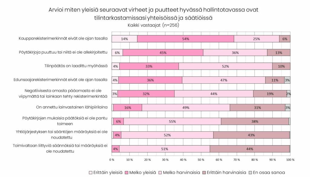 Selvitimme kyselyllä myös tilintarkastajien käsityksiä tietyistä hallintoon liittyvistä asioista, kuten kaupparekisterimerkinnöistä, pöytäkirjoista sekä lakien ja määräysten mukaan toimisesta. Tilintarkastajilta kysyttiin, kuinka usein he kohtaavat näissä asioissa virheitä ja puutteita tilintarkastusta tehdessään.