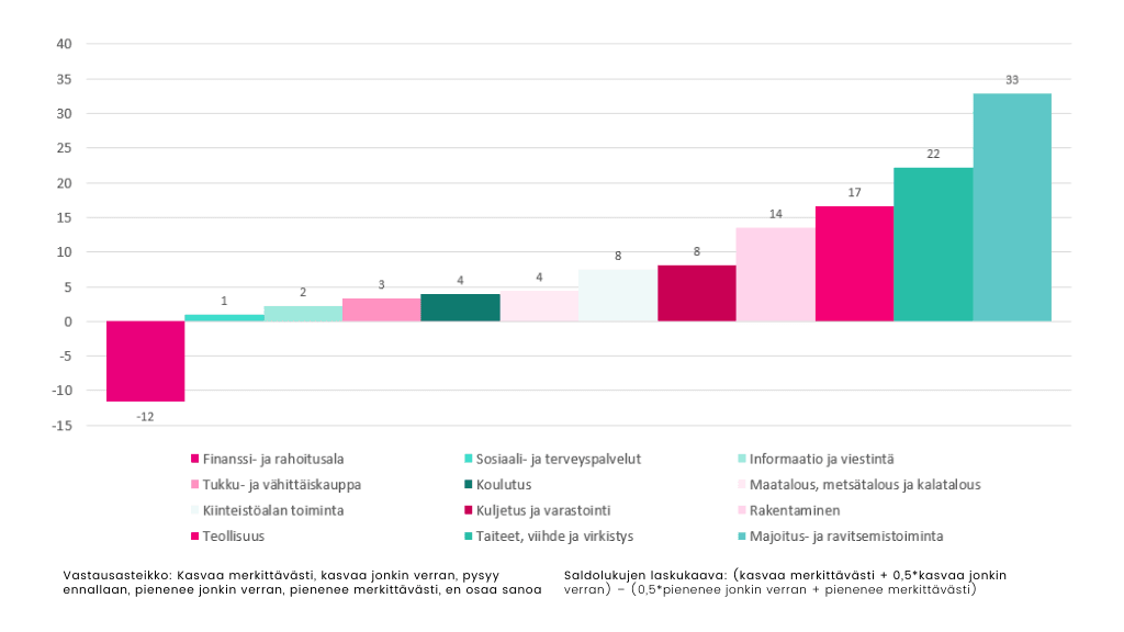 Liikevaihdon kehityksen näkökulmasta päättynyt vuosi runteli erityisesti majoitus- ja ravitsemustoiminnan sekä taide, viihde ja virkistysalan yrityksiä. Tukku- ja vähittäiskaupan sekä rakentamisen toimialoilla vuosi oli sen sijaan positiivinen.