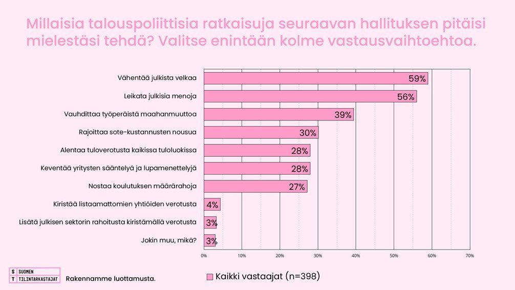 Tilintarkastajat ovat huolissaan julkisen talouden alijäämästä. Suomen Tilintarkastajat ry:n Tilintarkastajabarometrissa 59 prosenttia tilintarkastajista nostaa seuraavan hallituksen talouspolitiikan tärkeimpien ratkaisujen listalle julkisen velan vähentämisen (kuvio 1).