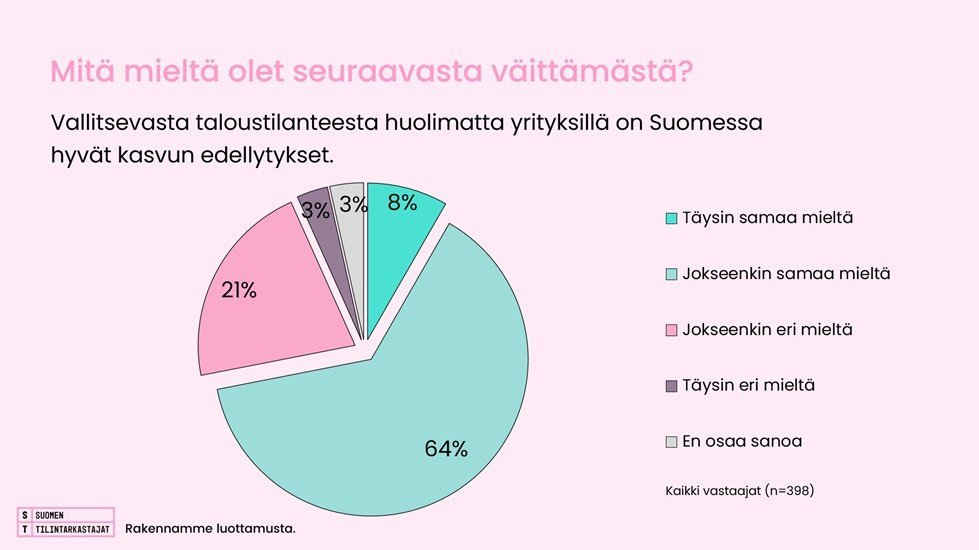 Enemmistö tilintarkastajista arvioi, että ”Vallitsevasta taloustilanteesta huolimatta yrityksillä on Suomessa hyvät kasvun edellytykset”. Täysin tai jokseenkin samaan mieltä väittämän kanssa on 72 prosenttia tilintarkastajista. Eri mieltä olevien osuus on 24 prosenttia. (Kuvio 2.)