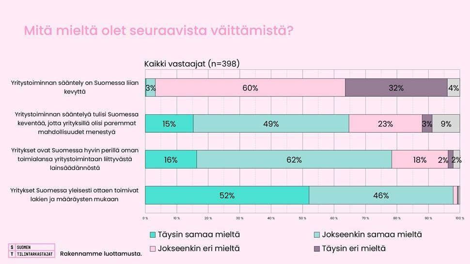 Tilintarkastajista 92 prosenttia torjuu väitteen ”Yritystoiminnan sääntely on Suomessa liian kevyttä”. Lisäksi tilintarkastajat arvioivat, että yritykset ovat hyvin perillä oman toimialansa sääntelystä ja yleisesti ottaen myös toimivat lakien ja määräysten mukaan.