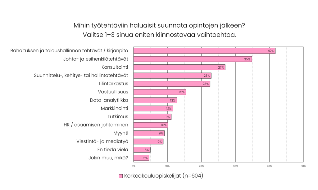 Aula Research Oy toteutti Suomen Tilintarkastajien toimeksiannosta kyselyn lukiolaisille, talous- ja yhteiskunnallisten alojen korkeakouluopiskelijoille sekä korkeakouluun hakeville. Kyselyyn vastasi 1004 vastaajaa ja se toteutettiin sähköisenä kyselynä helmi-maaliskuussa 2024.