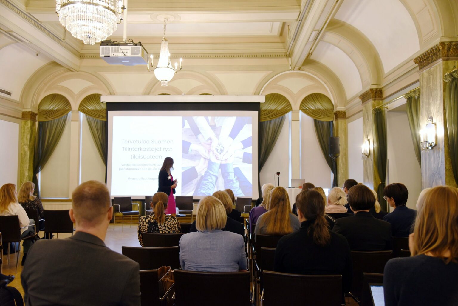 Toiminnanjohtaja Sanna Alakare avaamassa Suomen Tilinrtarkastajat ry:n sidosryhmätilaisuutta.